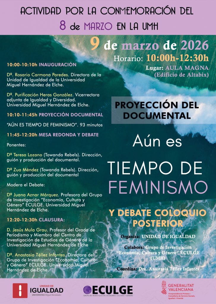 La Universidad Miguel Hernández (UMH) se suma una vez más a las celebraciones por el Día Internacional de la Mujer con una jornada dedicada a la reflexión y el análisis feminista. El próximo lunes 9 de marzo de 2026, el Aula Magna del edificio Altabix (campus de Elche) acogerá el evento «Aún es tiempo de feminismo», organizado por la Unidad de Igualdad de la institución. El acto es de entrada libre limitado al aforo.
